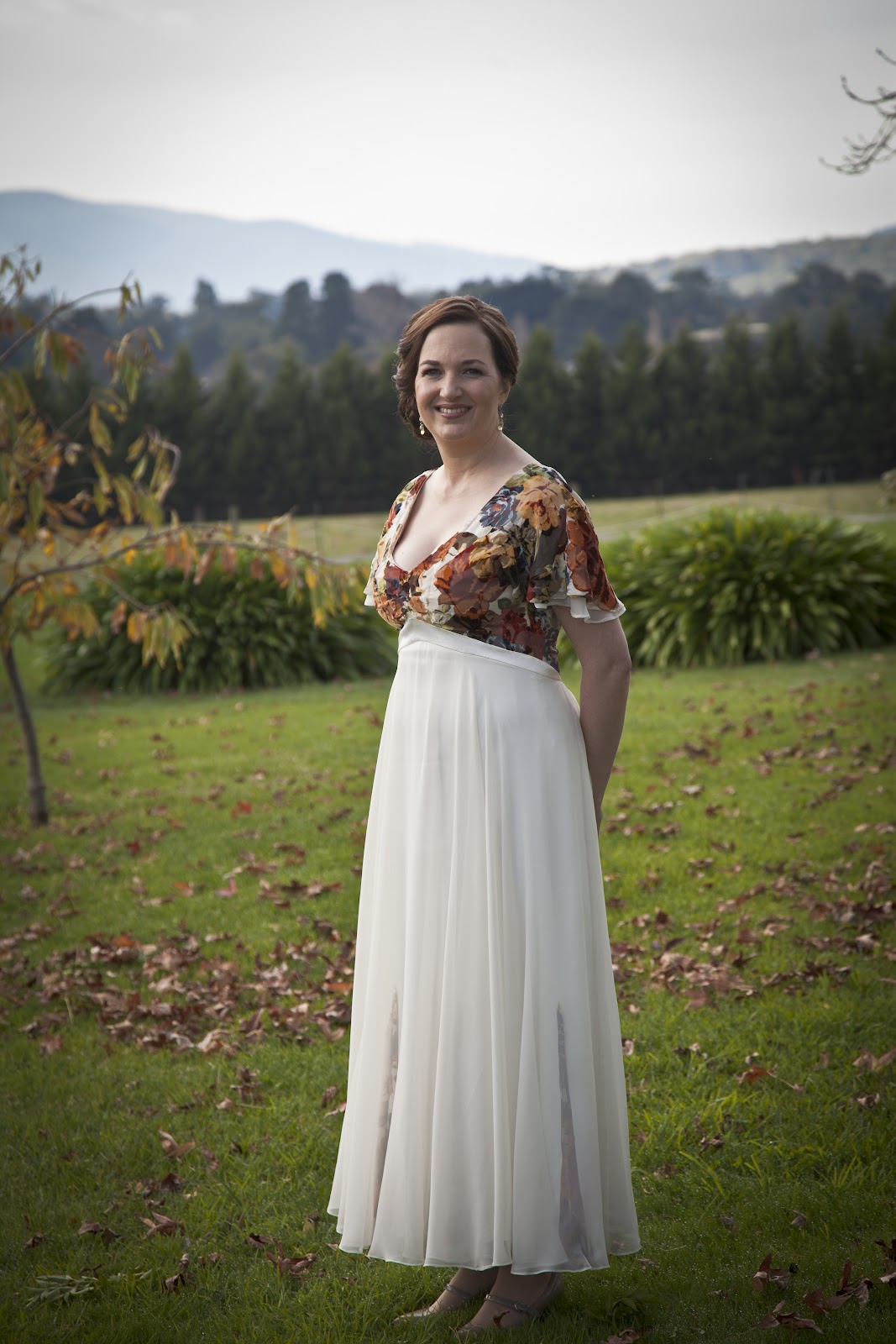 complimented her beautiful pale complexion and warm brunette hair. We agreed that layers, and some kind of heavier fabric would be appropriate, necessary even for a June wedding in the hills.